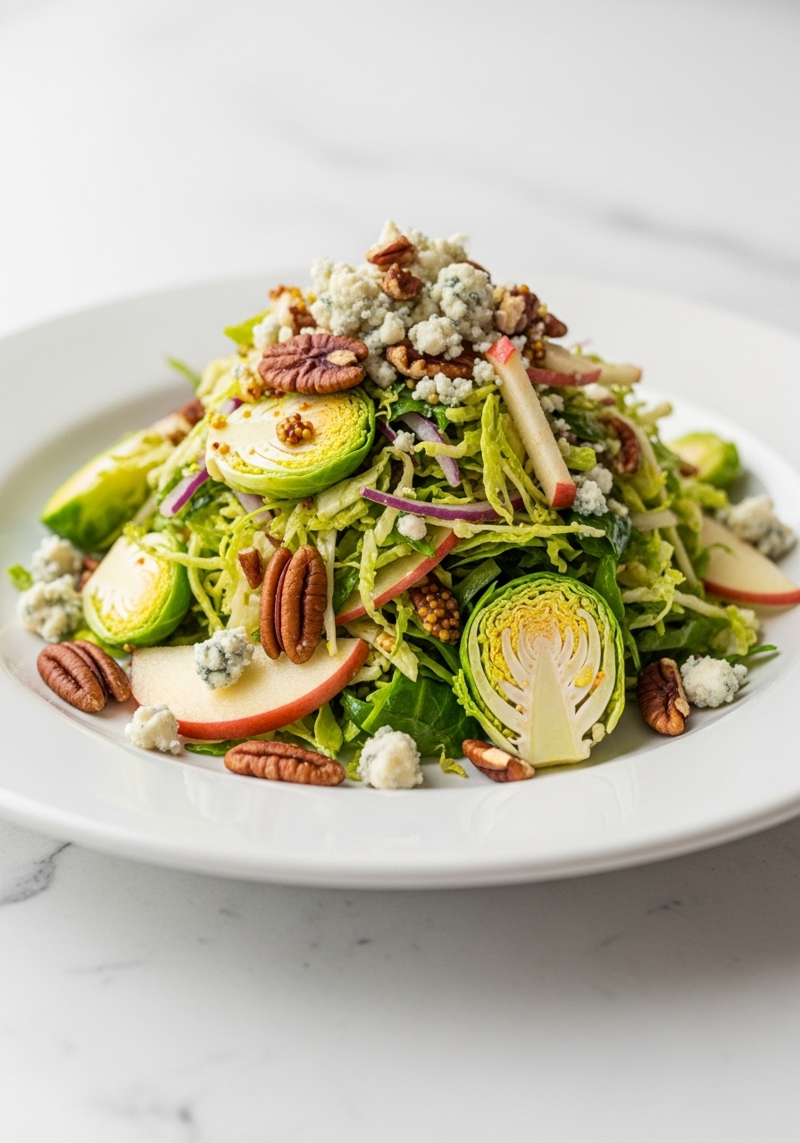 This Autumn Brussels Sprout Salad, featuring crisp apples, crunchy pecans, and tangy blue cheese, makes for a delightful accompaniment to roasted chicken, pork, or your Thanksgiving turkey feast.