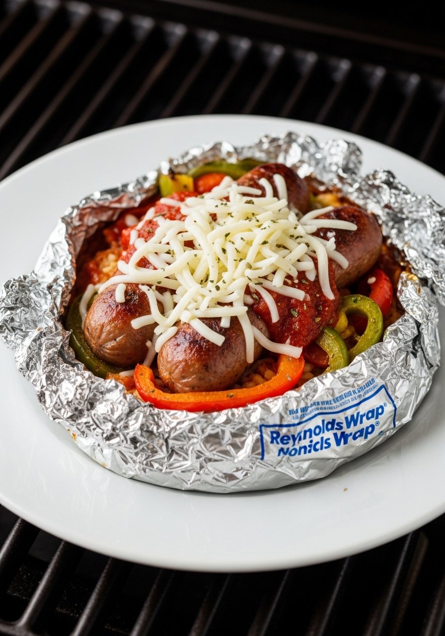 Carefully open the foil packets, slice the sausage, and distribute the pieces among the packets. Top each with 2 tablespoons of cheese, leaving them open.