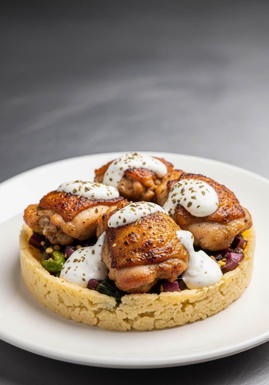 Add the cooked chicken on top and drizzle with the chilled yogurt sauce (which serves as your dressing) and harissa, if you like a bit of heat.