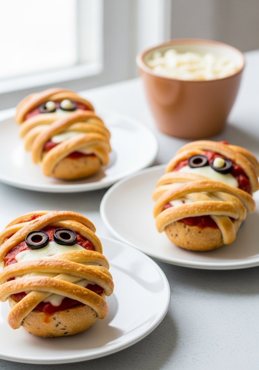 Position two olive slices on each piece to represent eyes. Scatter the cheese strips haphazardly over the sauce to create a mummy effect. Bake on the center rack until the cheese is melted, bubbly, and the bread is crisp, which should take about 8 minutes.