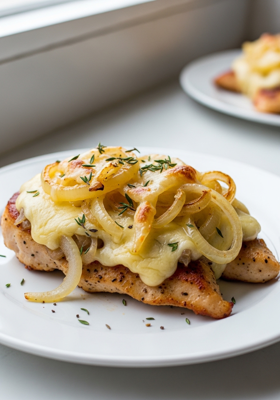 Return the chicken to the skillet, layering the sautéed onions and cheese on top. Cover and cook on low heat for 3 to 5 minutes, or until the cheese melts and starts to bubble.