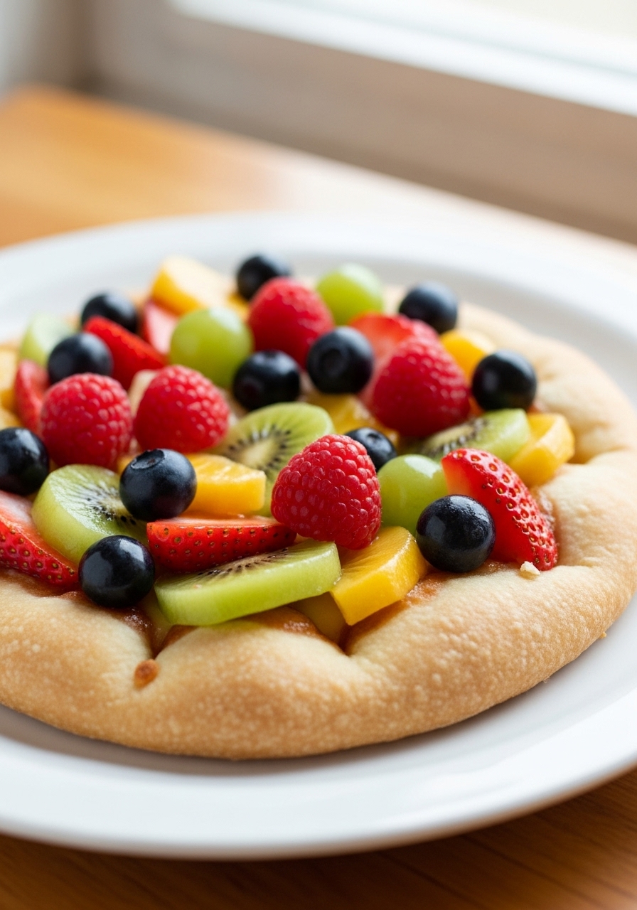 This delightful fruit pizza features a healthier version of a sugar cookie base, elegantly layered with airy cream cheese frosting and adorned with vibrant, fresh fruits!
