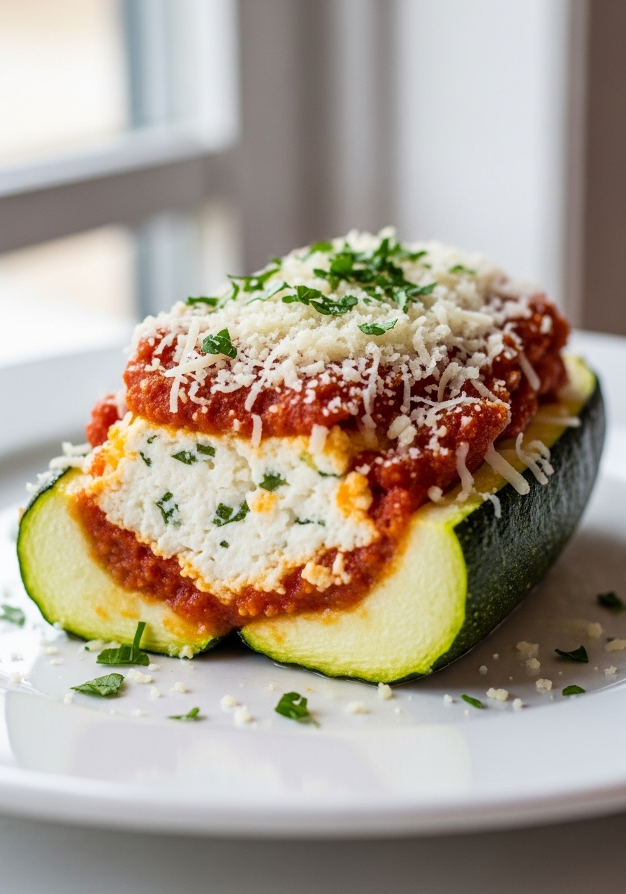 Top each zucchini slice with a generous tablespoon of sauce, followed by a tablespoon of the cheese mixture.
