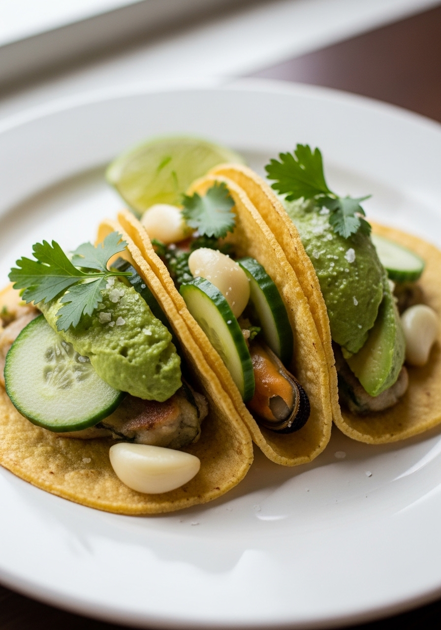 "Enjoy these vibrant Green Scallop Tacos, topped with a zesty cucumber and avocado salsa infused with green herbs and finished with a splash of fresh lime juice. They're absolutely delicious!"