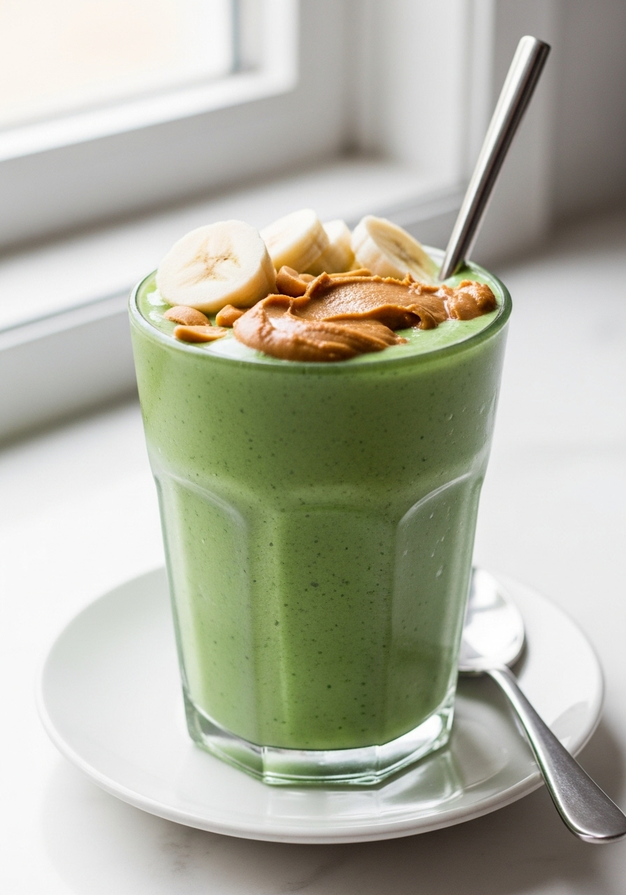 Indulge in a delightful Green Smoothie crafted from ripe bananas, fresh spinach, creamy peanut butter, yogurt, and almond milk, all packed with protein! For an extra boost, feel free to toss in a scoop of your favorite protein powder.