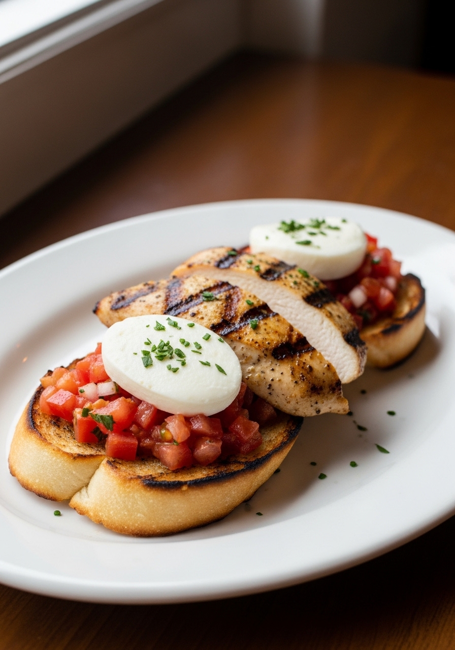 Grill the chicken for 2 minutes on each side, then remove and place on a serving platter. Top with the bruschetta mixture and enjoy.