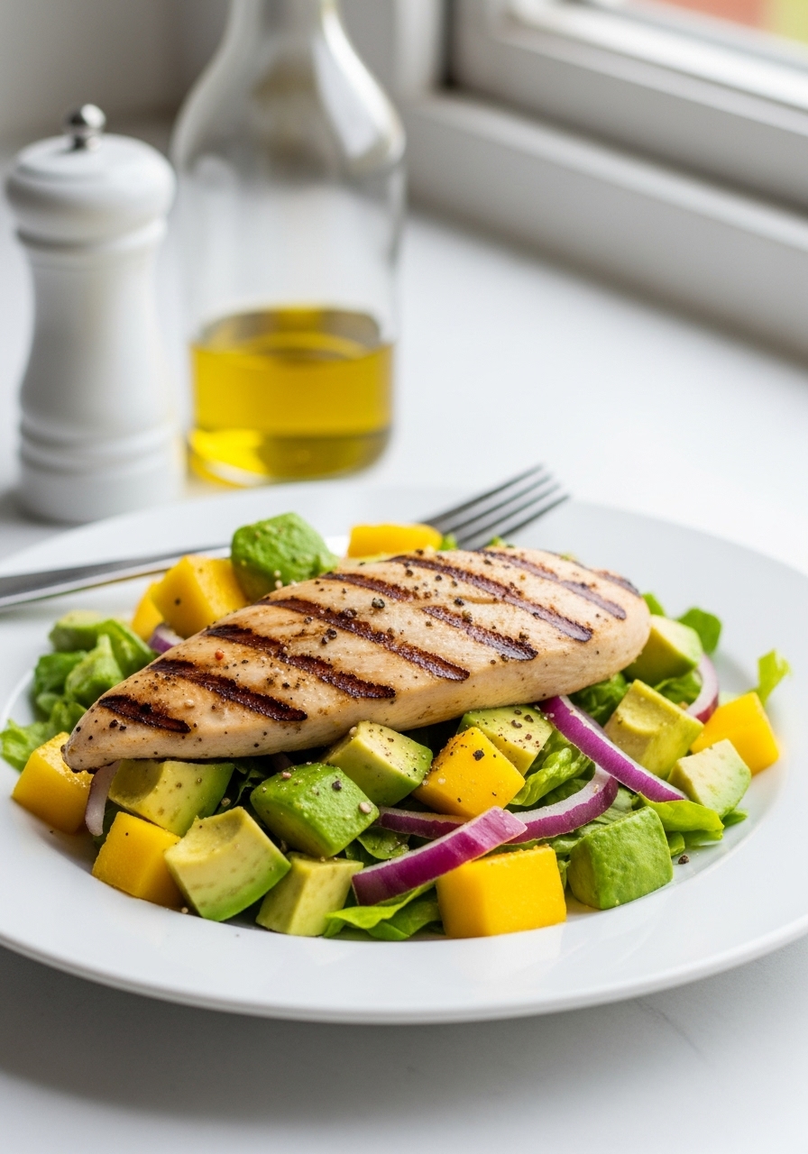 In a separate bowl, gently mix together the avocado, mango, grilled chicken, and red onion.