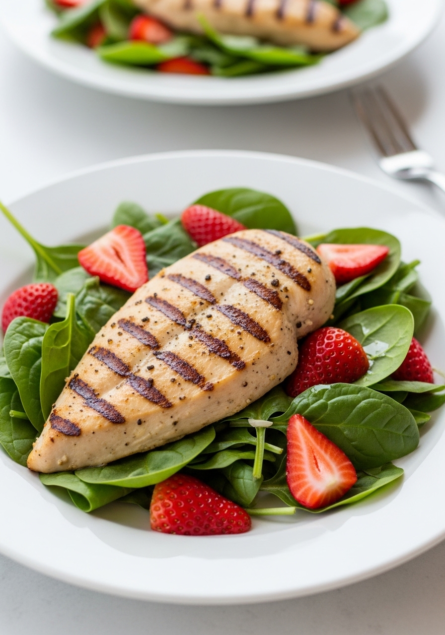 Distribute the dressed spinach among four plates and garnish with sliced strawberries, crumbled goat cheese, and the grilled chicken.