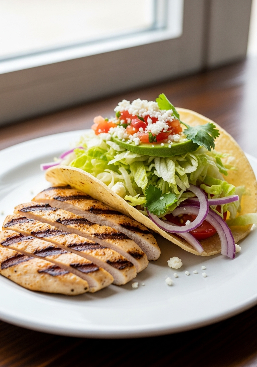 Savor the flavor of grilled chicken tacos generously topped with a refreshing lettuce and tomato slaw, creamy avocado, and crumbled Cotija cheese, all nestled in a perfectly charred tortilla. This dish makes for an effortless dinner option on a busy weeknight!