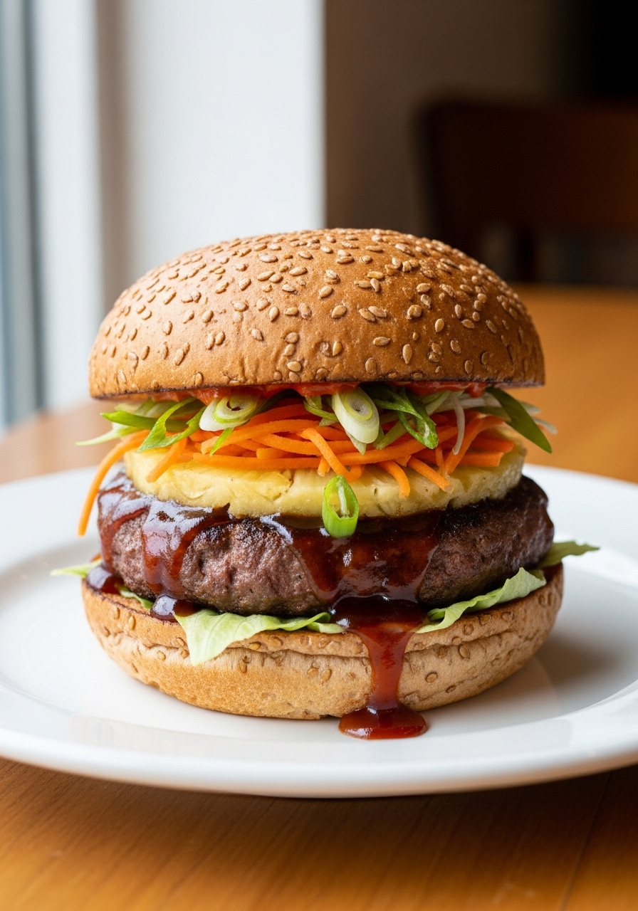 Experience the flavors of the islands with this simple Grilled Hawaiian Teriyaki Burger. Crafted from lean ground beef, this burger is infused with shredded carrots and fresh scallions, then elevated with the sweetness of grilled pineapple. To top it all off, a delightful homemade pineapple teriyaki sauce brings it all together for a mouthwatering bite.