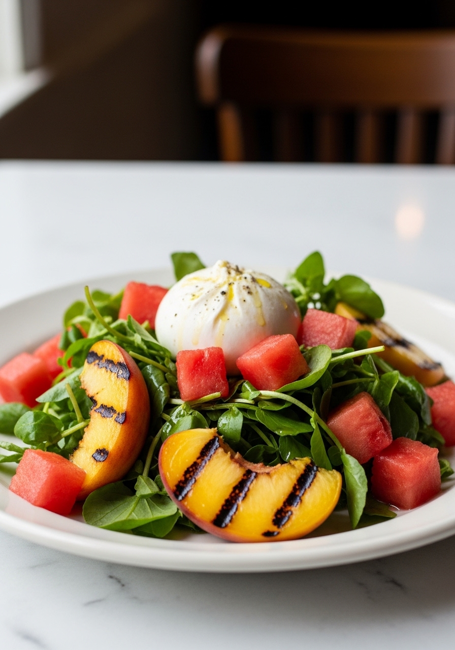 While burrata, a delectable cheese crafted from mozzarella and cream, takes center stage in this vibrant summer salad, the sweet grilled peaches and crisp watermelon are equally tempting.