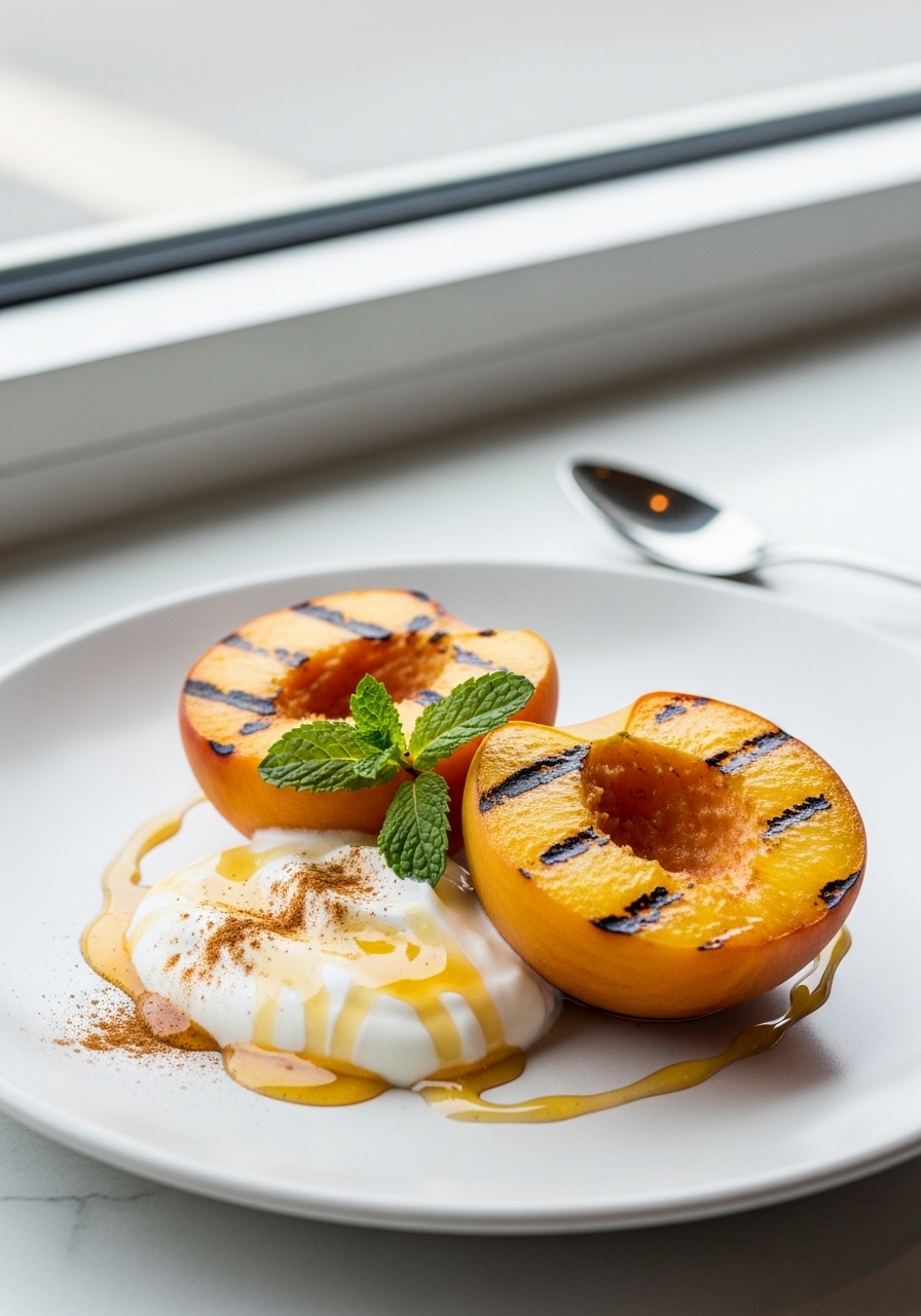 Drizzle honey over the grilled peaches and accompany each serving with 1 tablespoon of the cinnamon yogurt mixture.