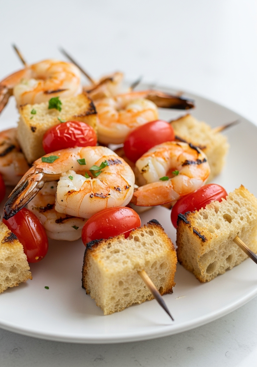 Grill the skewers for 2 to 3 minutes on each side, until the shrimp turn pink and firm up, and the bread gets a gentle char. The tomatoes may start to burst during grilling.