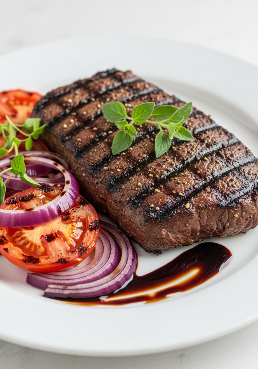"During the summer months, there's nothing quite like enjoying a Grilled Steak adorned with vibrant chopped tomatoes, zesty red onion, a drizzle of balsamic vinegar, and a touch of olive oil. This is undoubtedly one of my preferred methods for preparing steak when the weather is warm." Recipe title: "Grilled Steak With Tomatoes, Red Onion and Balsamic"