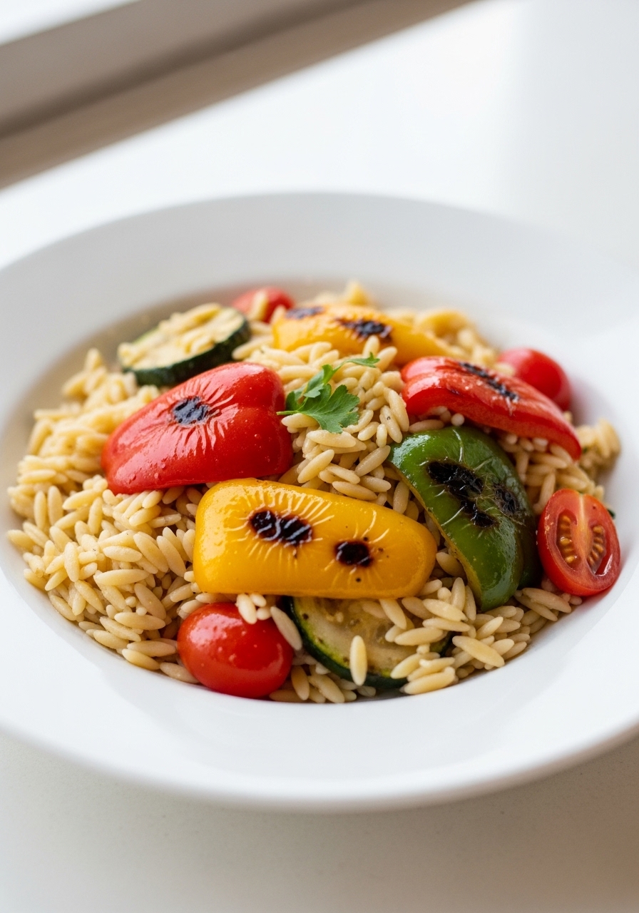 "Freshly grilled veggies sourced from the farmers market elevate this orzo pasta salad, making it an ideal choice for a side dish or a satisfying meatless main course."