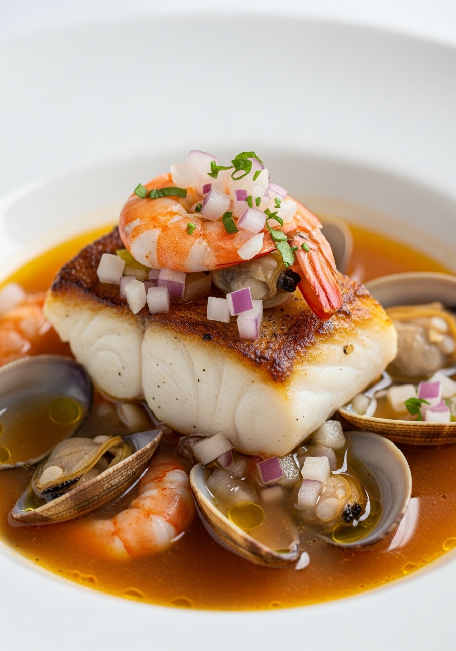 Indulge in a flavorful and robust seafood soup featuring tender halibut, succulent littleneck clams, and plump shrimp. Pair this delightful concoction with a slice of crusty bread, and you’ve got a satisfying meal that’s sure to please.