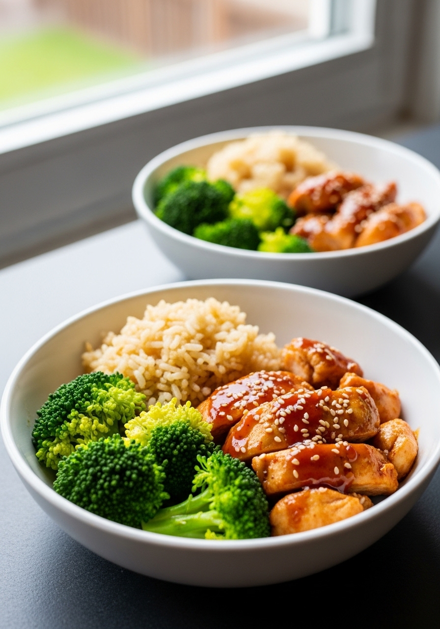 Portion the chicken and broccoli into 4 meal prep containers, and finish by garnishing with sliced scallions and a sprinkle of sesame seeds.