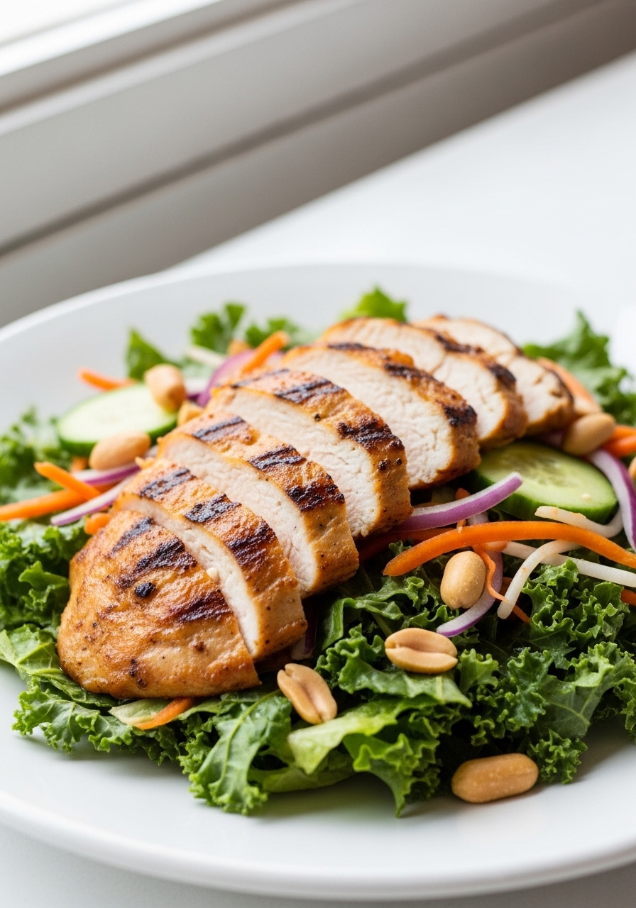 Experience the delightful flavors of Houston’s (Lightened-Up) Kale Salad with Peanut Vinaigrette, a truly gratifying dish. This vibrant salad features a medley of juicy grilled chicken, hearty kale, crisp cabbage, sweet carrots, crunchy peanuts, and fresh herbs like scallions, cilantro, and mint. All of these ingredients are beautifully combined and drizzled with a refreshing peanut-sesame dressing that ties everything together.