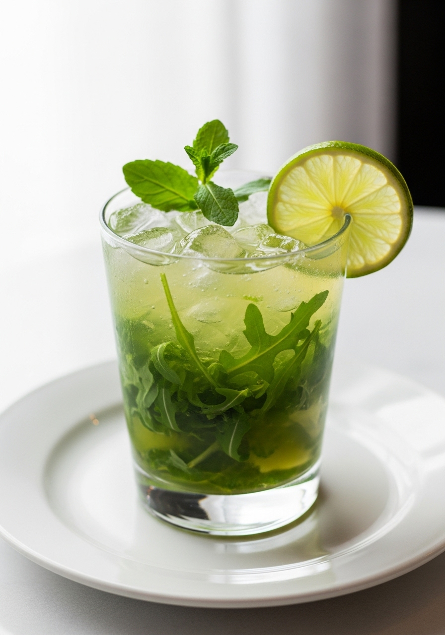 In a tall Collins glass, combine the lime juice, mint leaves, arugula, and sugar. Use a muddler to gently press the mixture until the mint is lightly bruised and the aromatic flavors are released.