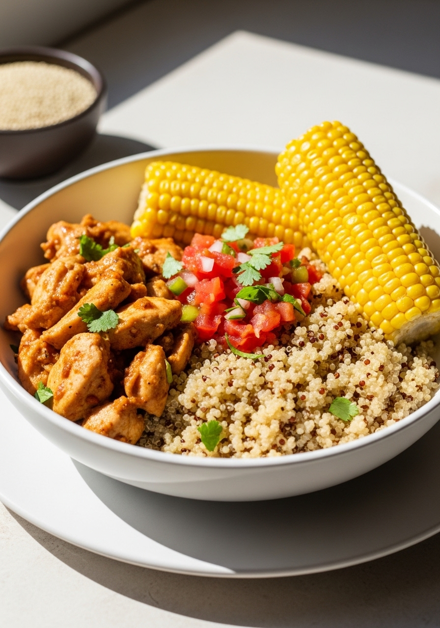 Assemble the bowls by placing 2/3 cup of quinoa in each one, followed by 1/2 cup of the shredded chicken topped with additional sauce, 1/3 cup of corn, 1/4 cup of diced tomatoes, and 1 ounce of avocado.