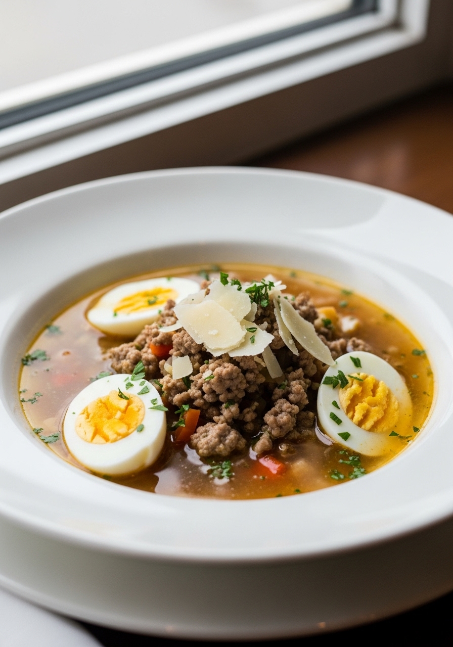 Once the broth reaches a boil, carefully add the meatballs, followed by the pasta and chopped escarole.