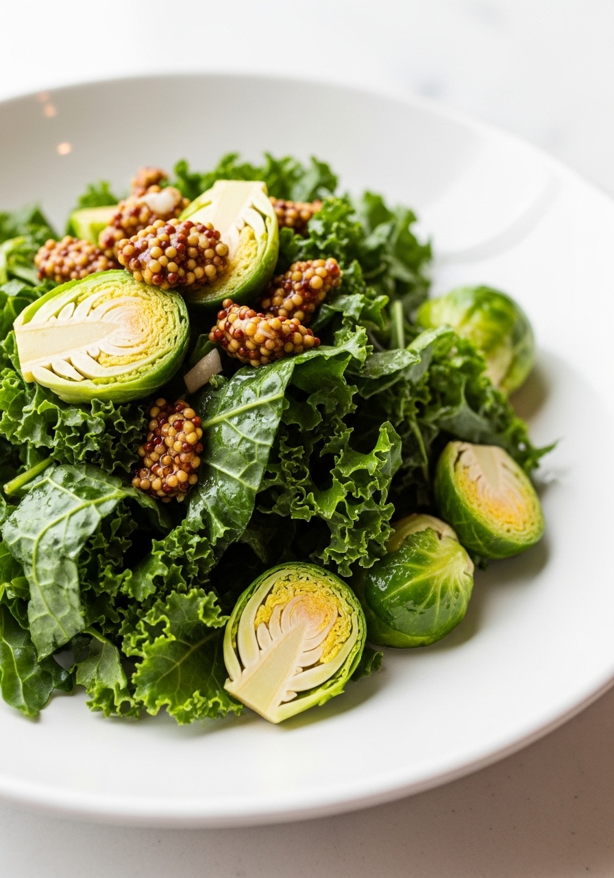 Drizzle the dressing over the kale and Brussels sprouts, then toss everything together until the greens are evenly coated.