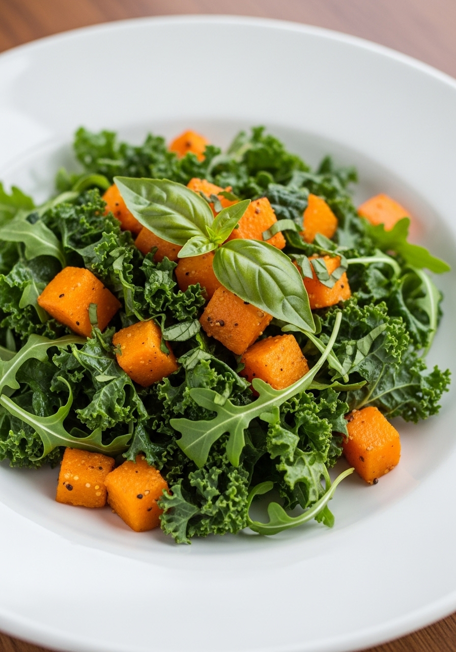 In two shallow serving bowls, mix together the roasted squash, kale, arugula, and basil. Toss the ingredients gently until they are thoroughly combined.