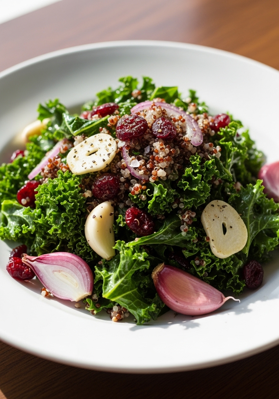 This robust autumn-inspired Kale Salad featuring Quinoa and Cranberries truly shines when you take the time to massage the kale. This technique helps to soften the fibrous leaves, resulting in a more tender texture and a milder taste, making the salad even more enjoyable.