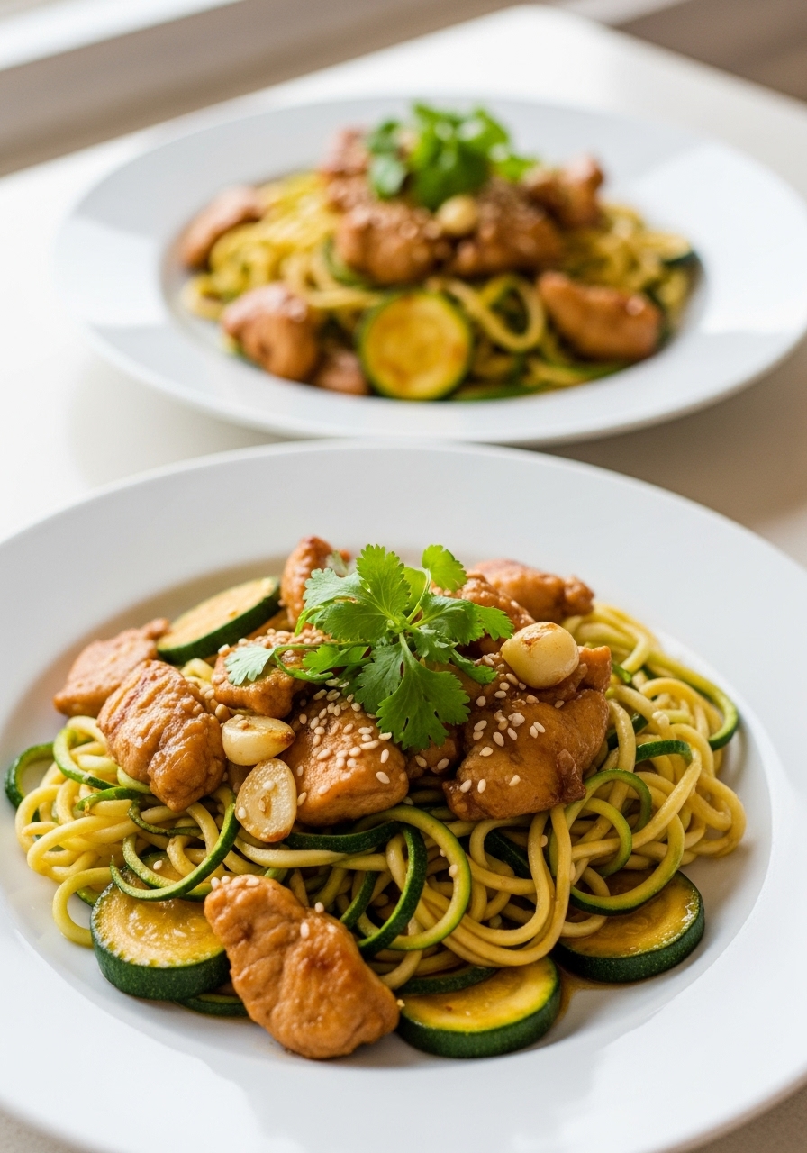 "Kung Pao Chicken Zoodles for Two – I replaced traditional noodles with spiralized zucchini, and the outcome was incredible! Best of all, it's under 300 calories."