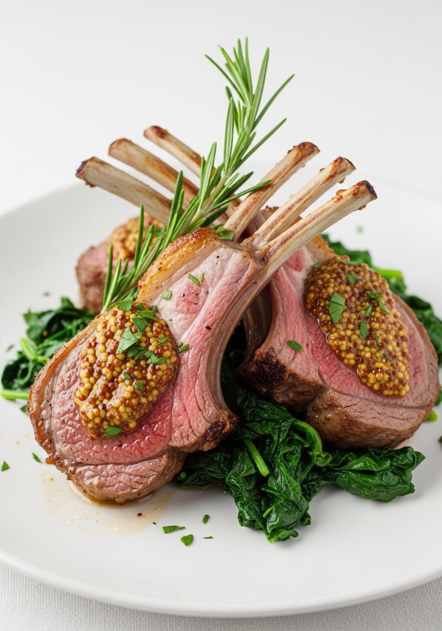Indulge in succulent lamb chops, perfectly marinated in a flavorful blend of Dijon mustard, aromatic garlic, tangy balsamic vinegar, and a selection of fresh herbs. These delectable chops are served atop a vibrant bed of wilted baby spinach sautéed in garlic and oil. It's a dish so delightful, you'll find yourself savoring every last bite!