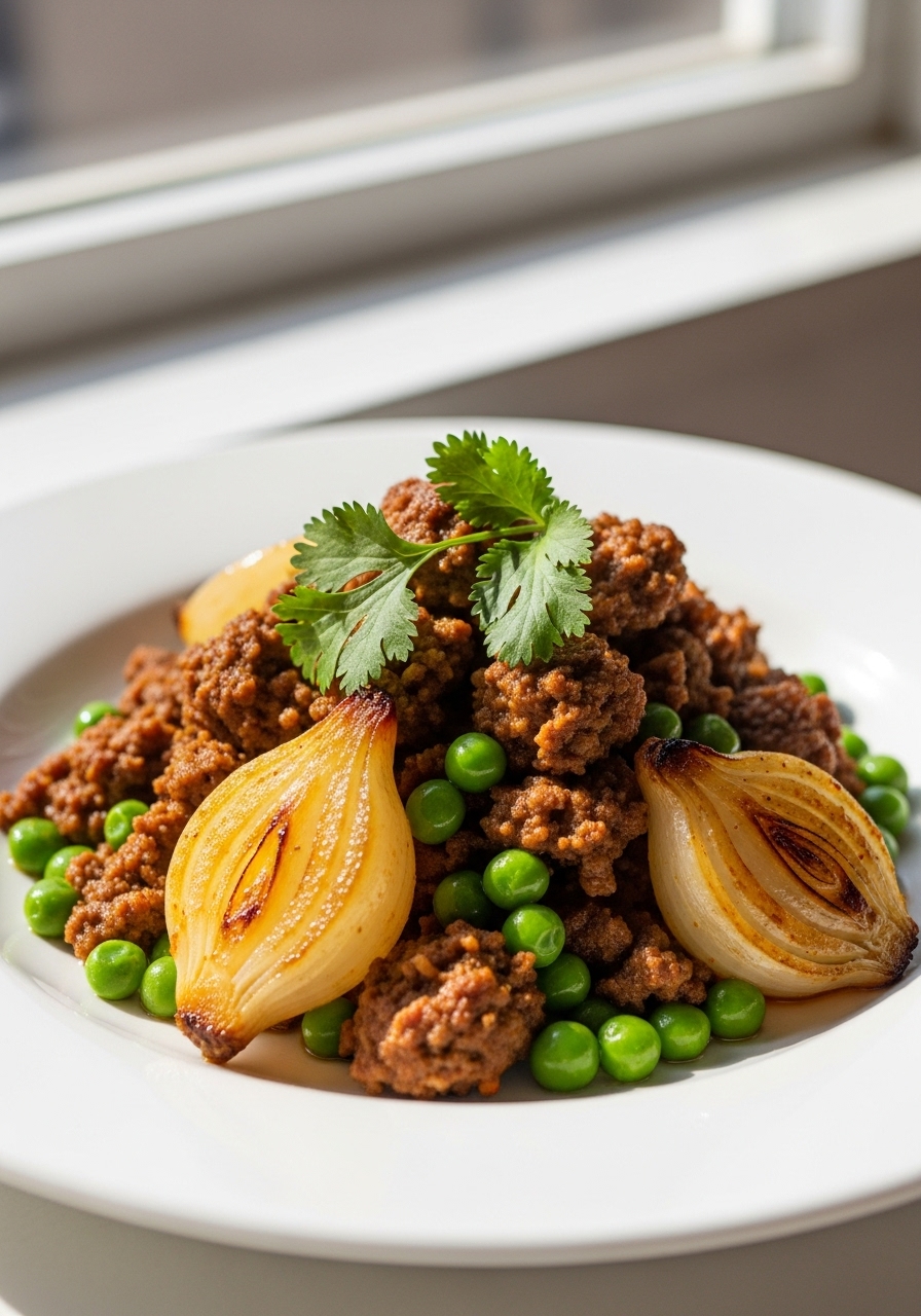 Lamb Keema with Peas is a classic Indian delicacy featuring seasoned minced meat, sautéed onions, and typically enriched with peas or potatoes for added texture and flavor.
