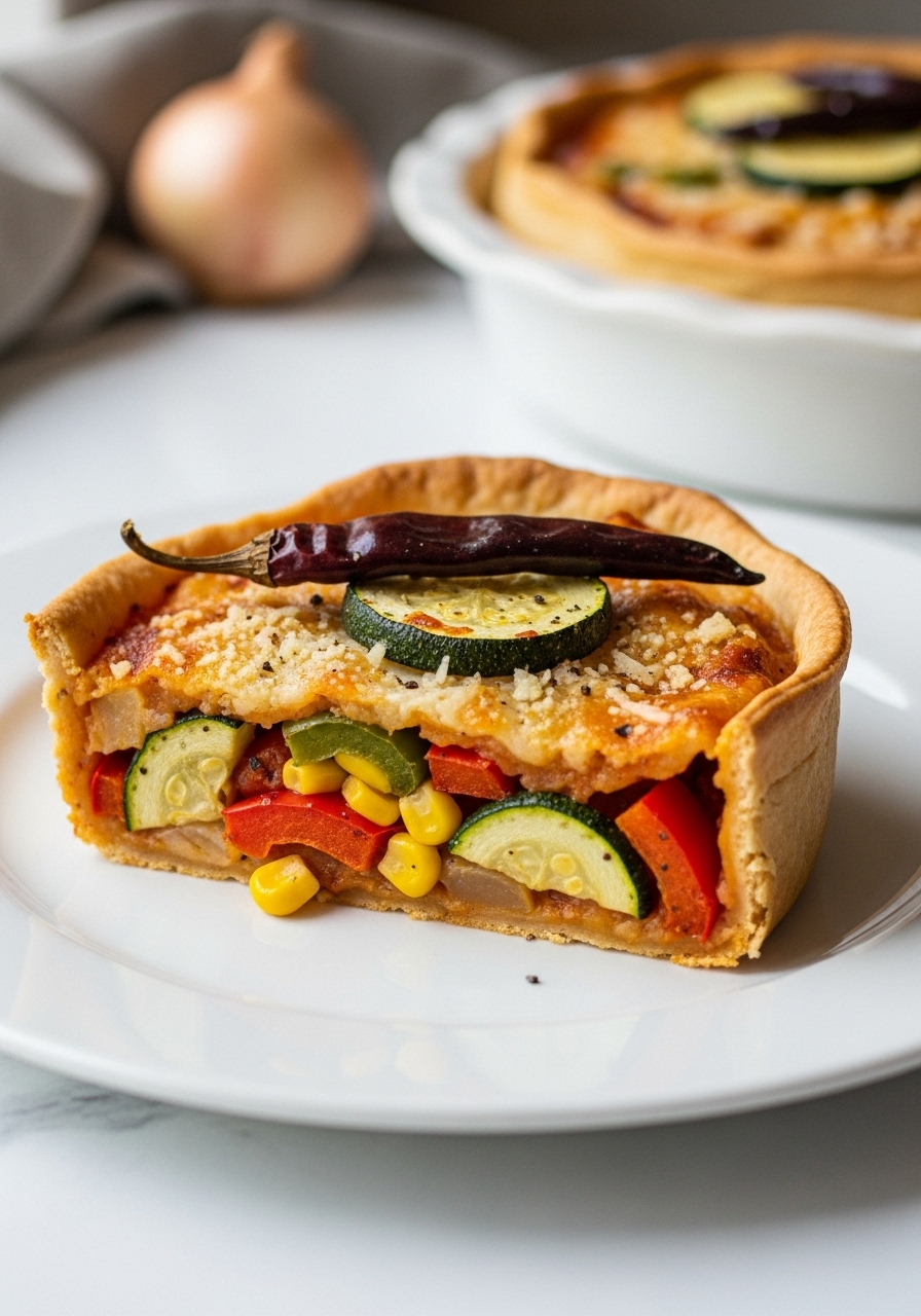 "Late Summer Vegetable Enchilada Pie – This delightful Mexican-American casserole resembles a hearty lasagna, featuring layers of vibrant vegetables, tortillas, rich sauce, and melted cheese. It's an ideal dish for entertaining a large group or for meal prep, as you can easily store leftovers in the refrigerator or freeze in individual servings once cooled."