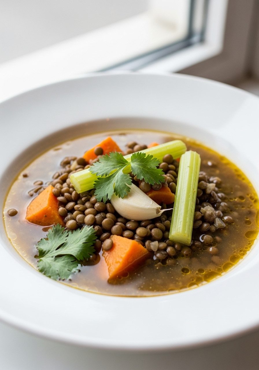 Prepare a generous batch of this nutritious Lebanese Lentil Soup, which is both vegetarian and vegan-friendly. This delightful dish features green lentils, hearty kale, vibrant sweet potato, zesty ginger, and a generous touch of garlic and lemon for a burst of flavor.
