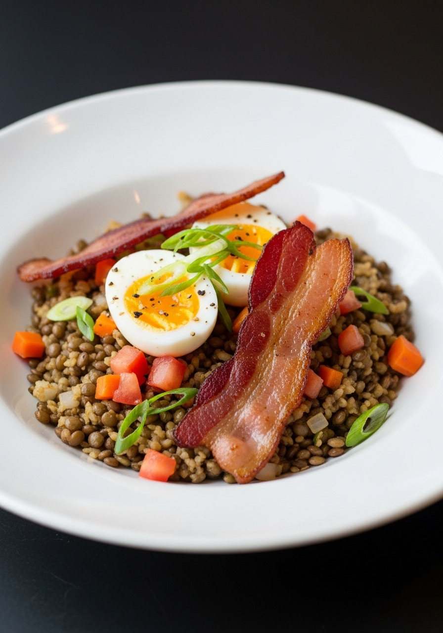 To serve, spoon 2/3 cup of the lentil mixture over 3/4 cup of rice. Garnish with half of a chopped egg, a slice of bacon cut into pieces, some scallions, and season with salt according to your preference.