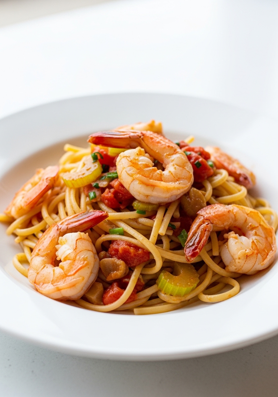 Indulge in the zesty flavors of this Italian-American Shrimp Fra Diavolo, elegantly nestled atop a bed of linguini. It's an ideal choice for those who adore seafood!