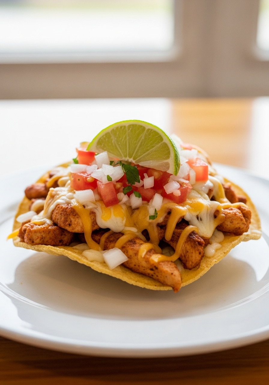 These simple loaded chicken "nacho" tostadas are a fantastic way to transform classic nacho flavors into a hearty main course. Piled high with gooey cheese, fresh tomatoes, creamy guacamole, savory olives, and spicy jalapenos, they offer a delightful twist on a beloved favorite.