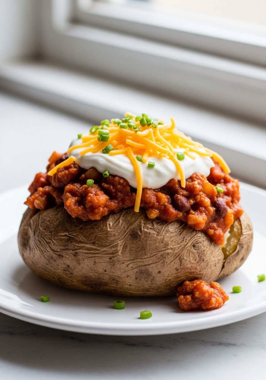 Savor this hearty baked potato, generously filled with savory lean turkey chili and sprinkled with reduced-fat shredded cheese. Finished off with a dash of fresh chives, this dish makes for a simple and satisfying weeknight dinner.