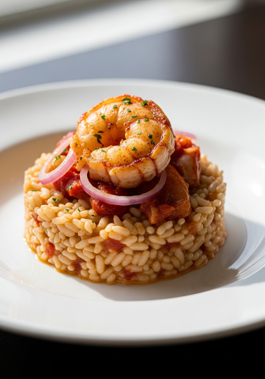 Indulge in the rich flavors of this exquisite Lobster Risotto, featuring succulent pieces of lobster and vibrant cherry tomatoes enveloped in a luscious sherry wine sauce.