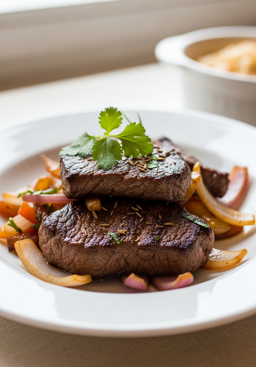 In the meantime, season the steak with salt, pepper, and cumin to taste.