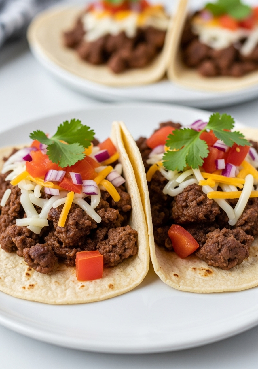 Prepare the taco shells following the package instructions. Once warmed, fill each shell with 1/4 cup of the cooked beef and top with shredded lettuce, 1 tablespoon of cheese, and diced tomatoes.