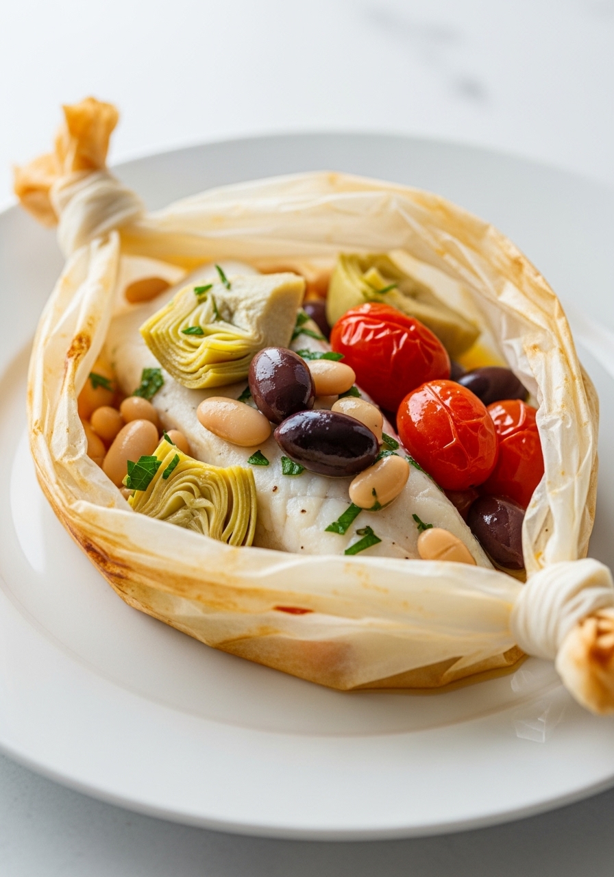 Savor the flavors of the Mediterranean with this delightful Fish en Papillote, featuring a medley of beans, Castelvetrano olives, tender artichoke hearts, juicy cherry tomatoes, and a sprinkle of fresh herbs. Each ingredient is wrapped together to create a delicious and aromatic dish that is both healthy and satisfying.