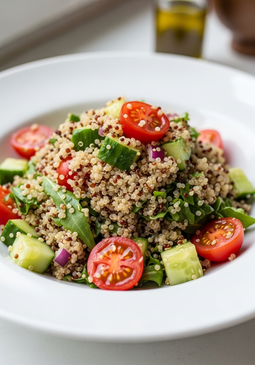 This vibrant Mediterranean Quinoa Salad is a delightful blend of flavors and textures, brimming with protein. It's crafted with crunchy cucumbers, juicy tomatoes, briny kalamata olives, and zesty red onion, all tossed together with premium extra virgin olive oil, a splash of lemon juice, and crumbled Feta cheese for a creamy finish.