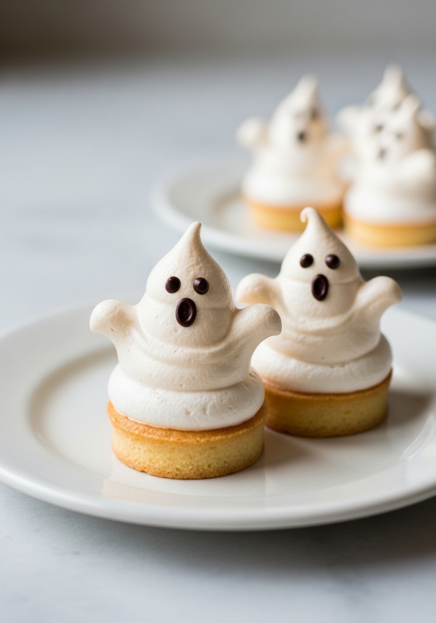 Delightful Halloween meringue phantoms crafted from sugar and egg whites, featuring tiny chocolate chips for their eyes. These sweet, airy treats dissolve in your mouth, evoking the taste of fluffy marshmallows.
