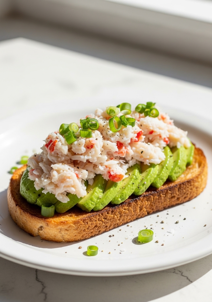 Generously spread the mashed avocado across the toast, then layer the crab mixture on top. Garnish with sliced radish, the remaining cilantro, chopped green onion, a light dusting of paprika, and an additional pinch of salt and pepper. Drizzle with olive oil, slice the toast in half, and serve right away.