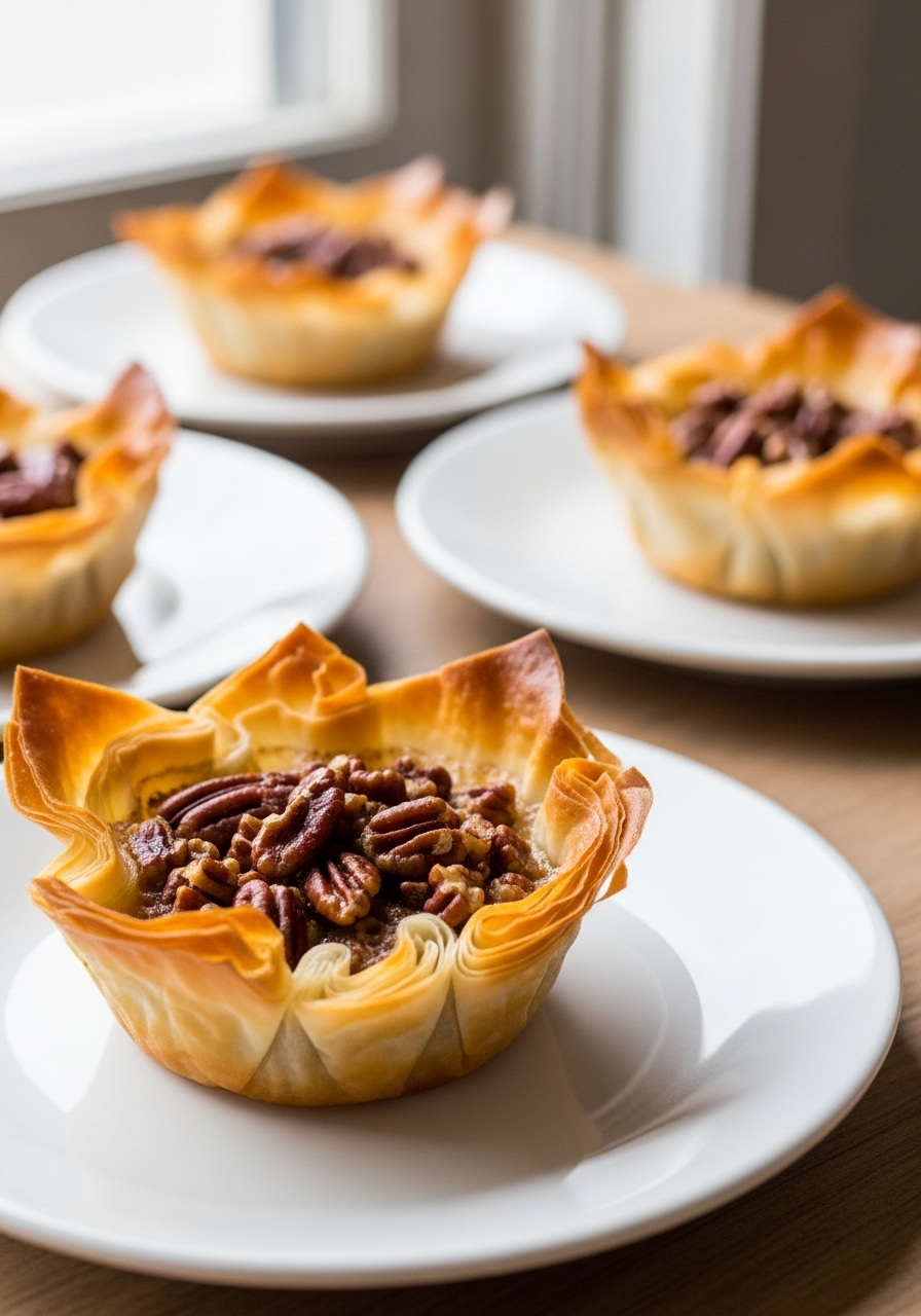Place the mini phyllo shells onto a baking tray. Spoon a generous teaspoon of the pecan mixture into each shell. If there is any leftover filling, divide it evenly among all the shells.