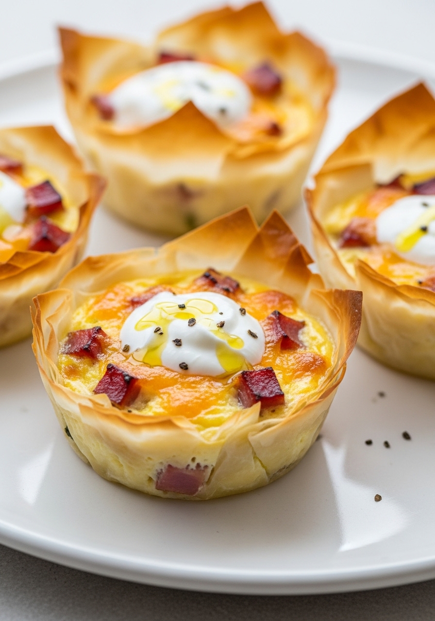 Distribute approximately 1 tablespoon of diced ham into each phyllo cup.