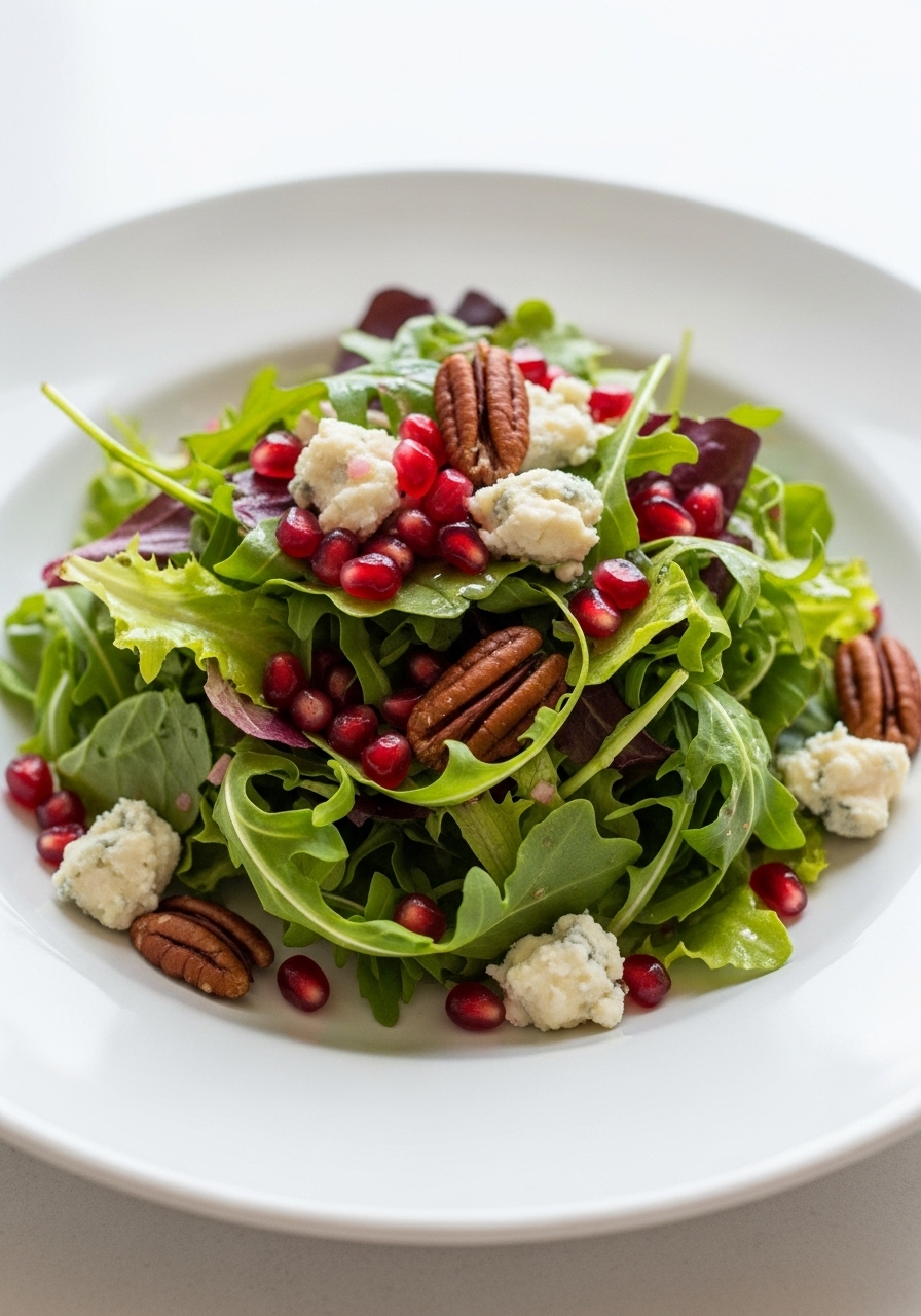 This stunning and flavorful salad, perfect for the cooler months of fall and winter, features a delightful combination of tender baby greens, juicy pomegranate seeds, creamy gorgonzola cheese, and crunchy pecans, all tossed in a tangy pomegranate vinaigrette.