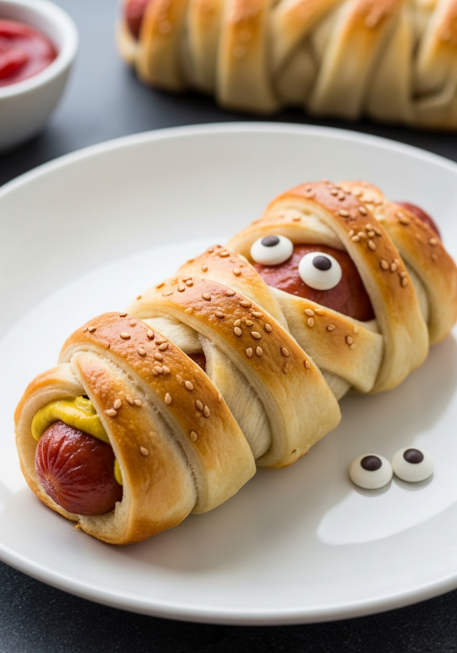 Once baked, use mustard or ketchup to attach the eyes. Let them cool for about 10 minutes before serving.
