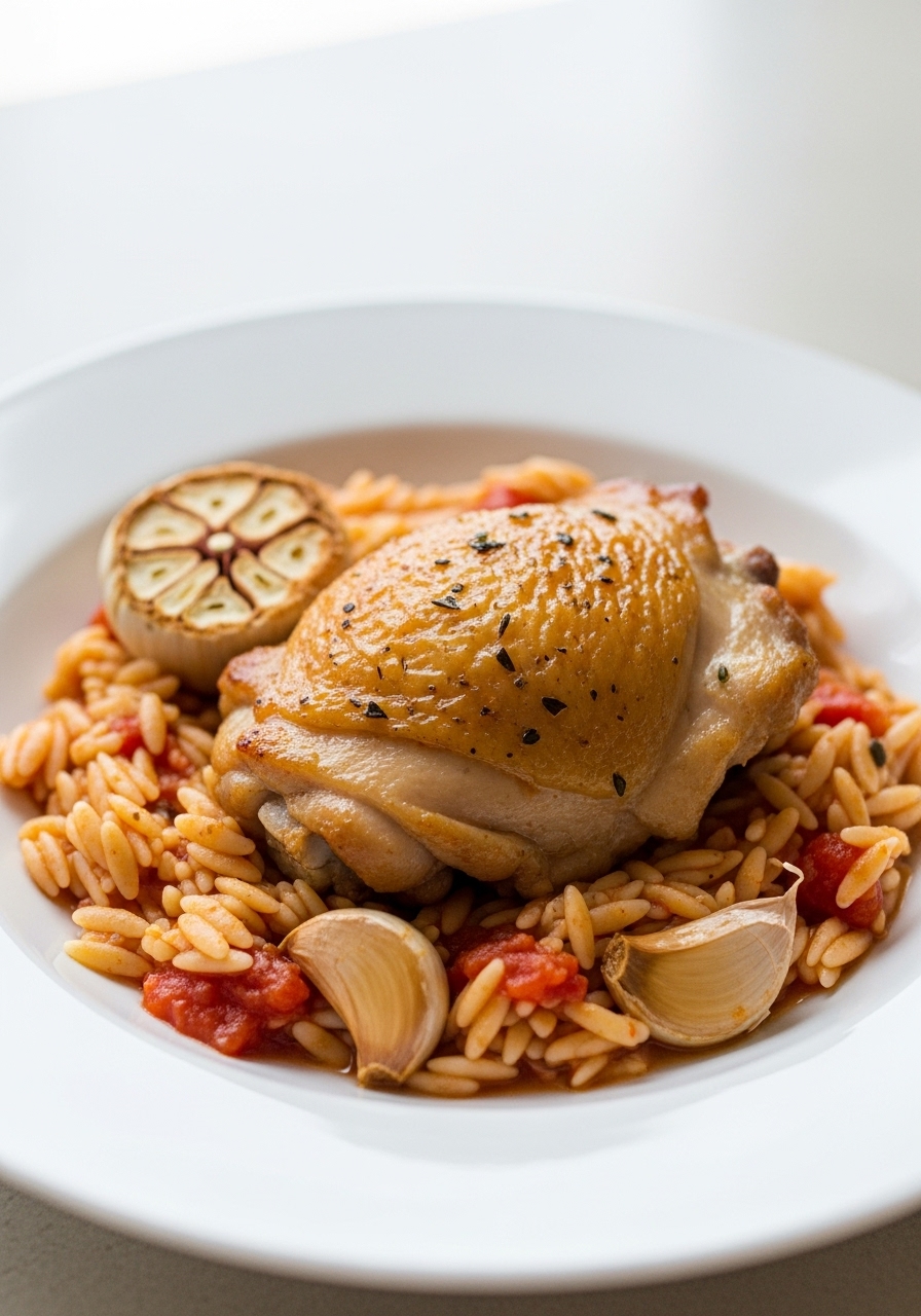 In this delightful One-Pot Chicken Orzo dish, succulent chicken thighs are seared to a golden crisp and nestled atop a bed of orzo simmered in a fragrant tomato sauce infused with garlic and fresh basil. This easy-to-prepare meal can be served directly from the oven, making it the perfect accompaniment to your preferred side salad.