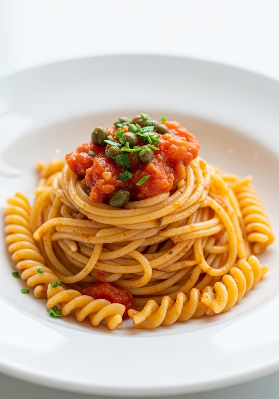 "One-Pot Spaghetti Puttanesca is brimming with robust and vibrant flavors thanks to the combination of anchovies, Kalamata olives, and capers – the perfect trio for a delightful puttanesca."